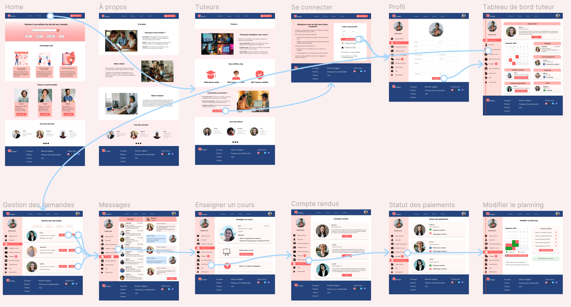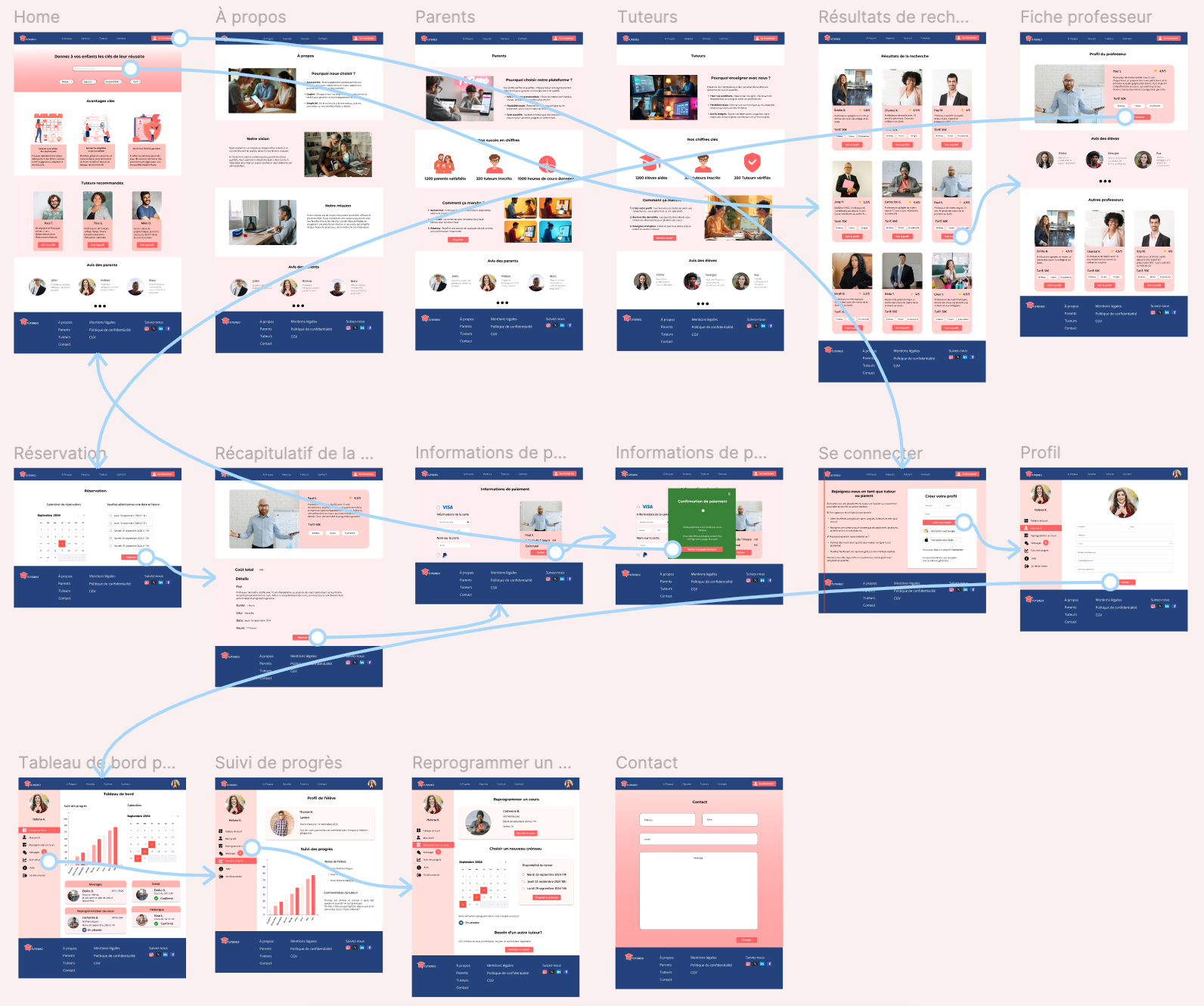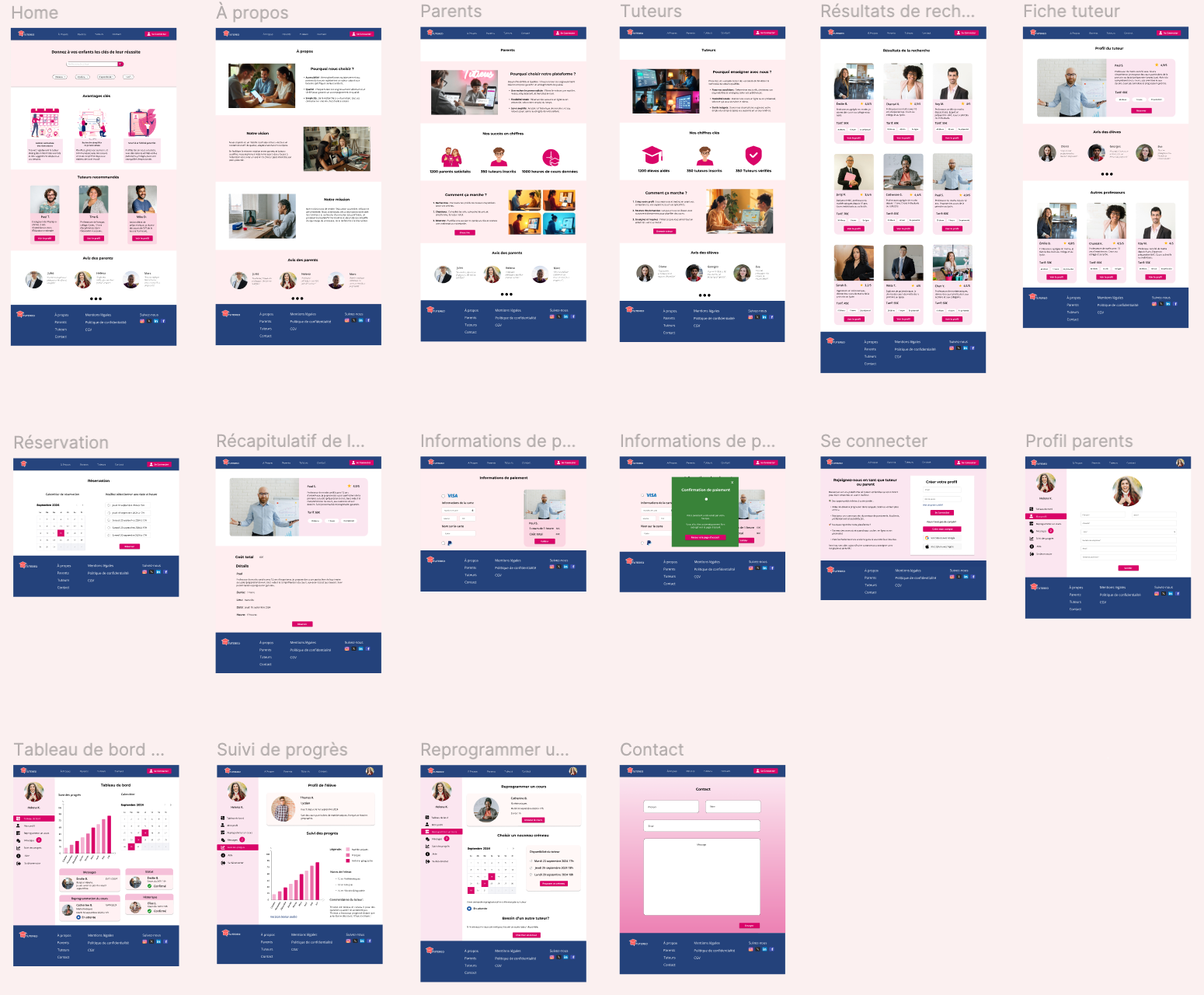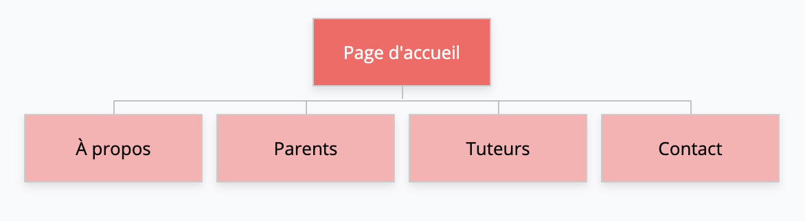L’architecture de l’information a été conçue de manière claire et hiérarchisée, en plaçant la page d’accueil au centre de la navigation et en organisant les contenus autour de quatre sections principales: À propos, Parents, Tuteurs et Contact. Cette structure permet d’assurer une orientation intuitive et un accès rapide aux informations clés de la plateforme.