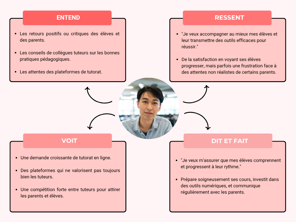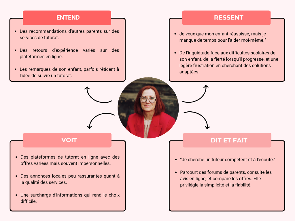 Pour comprendre les attentes réelles des utilisateurs, j’ai mené une recherche qualitative centrée sur deux profils clés : les parents à la recherche d’un soutien scolaire pour leurs enfants et les tuteurs souhaitant proposer leurs services. Cette phase a combiné entretiens individuels et questionnaires afin de recueillir des retours concrets sur leurs besoins, leurs frustrations et leurs habitudes actuelles.