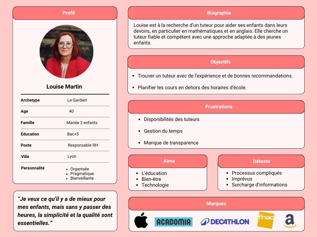 Louise veut être rassurée sur le sérieux du tuteur et la qualité des cours, tout en ayant une interface simple pour réserver rapidement, même dans son quotidien chargé.