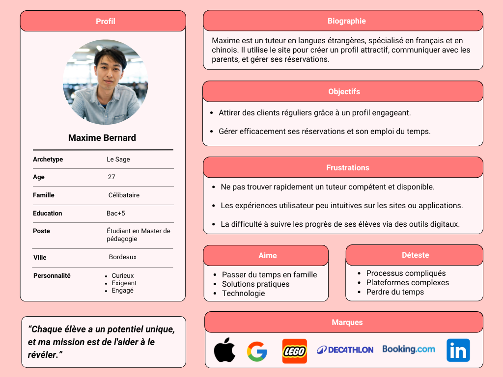 Maxime, jeune tuteur indépendant, souhaite trouver des élèves facilement tout en gardant le contrôle sur son emploi du temps.