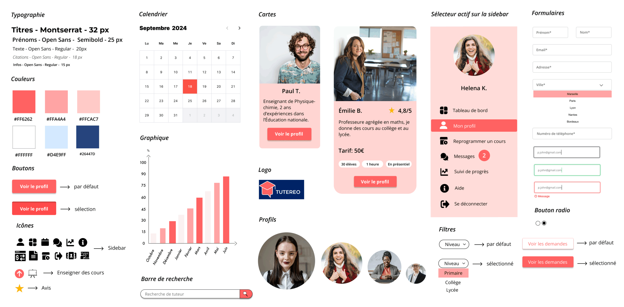 Ce UI kit a été conçu pour assurer une cohérence visuelle et fonctionnelle à travers l’ensemble de l’application. Il regroupe les éléments clés de l’interface : typographies, couleurs, composants (boutons, formulaires, cartes), ainsi que les icônes et graphiques. Chaque choix a été pensé pour garantir une navigation intuitive et une expérience utilisateur agréable. L’objectif est de créer une interface claire, accessible et engageante pour les élèves comme pour les tuteurs.