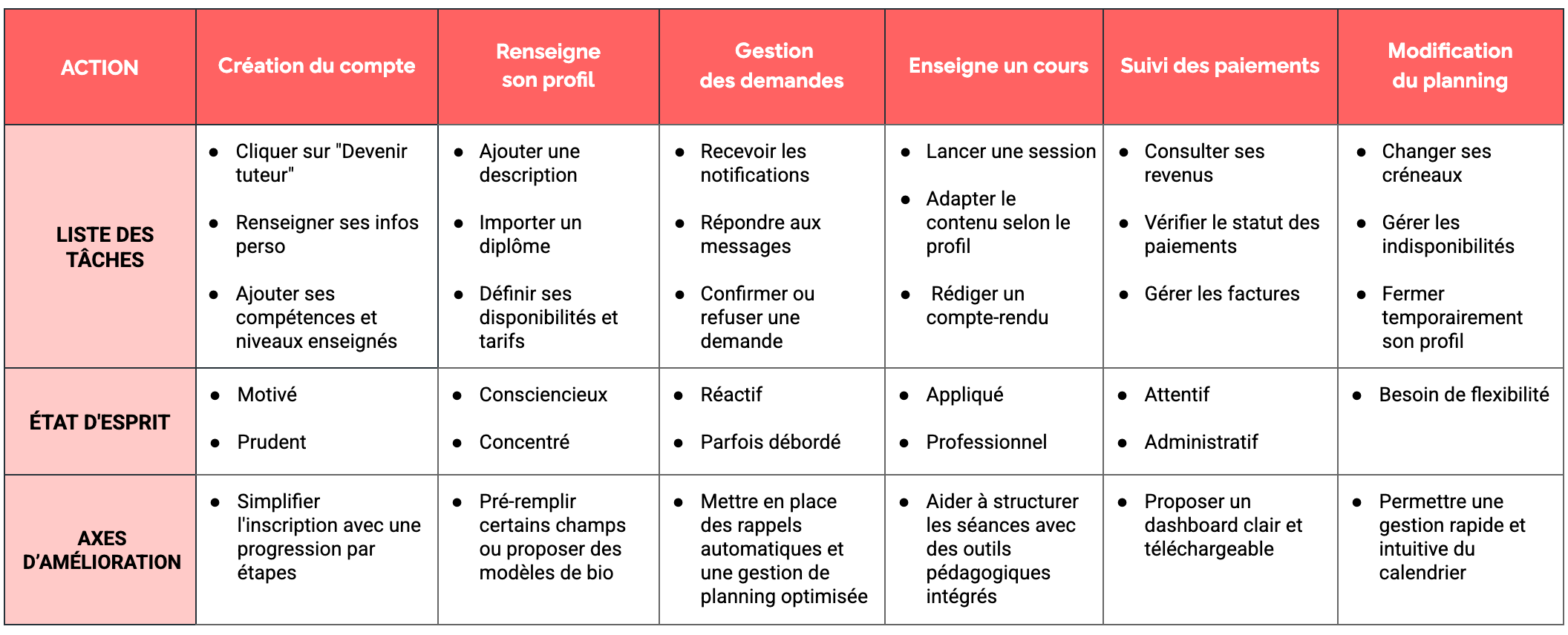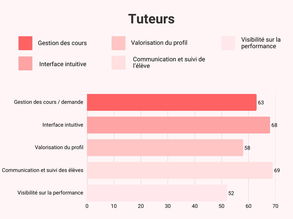 Les parents ont exprimé leur difficulté à trouver des tuteurs de confiance et bien qualifiés, soulignant l’importance d’une plateforme claire, fiable et facile à utiliser. De leur côté, les tuteurs recherchent une meilleure visibilité, des outils de gestion simplifiés, et un moyen efficace de communiquer avec les familles. Ces retours ont permis d’orienter les premières décisions de conception et de poser des bases solides pour construire une solution réellement utile.
