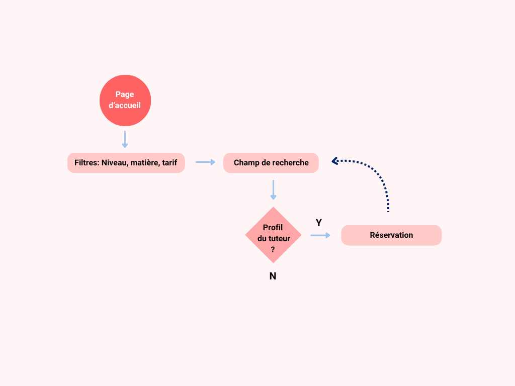 Louise commence son parcours sur la page d’accueil, où elle utilise les filtres pour préciser le niveau, la matière et le tarif souhaité. Elle saisit ensuite ses critères dans le champ de recherche. Si un profil de tuteur correspond à ses attentes, elle le consulte plus en détail. Lorsque le tuteur lui convient, elle passe à l’étape de réservation. Sinon, elle retourne à la recherche pour affiner son choix.