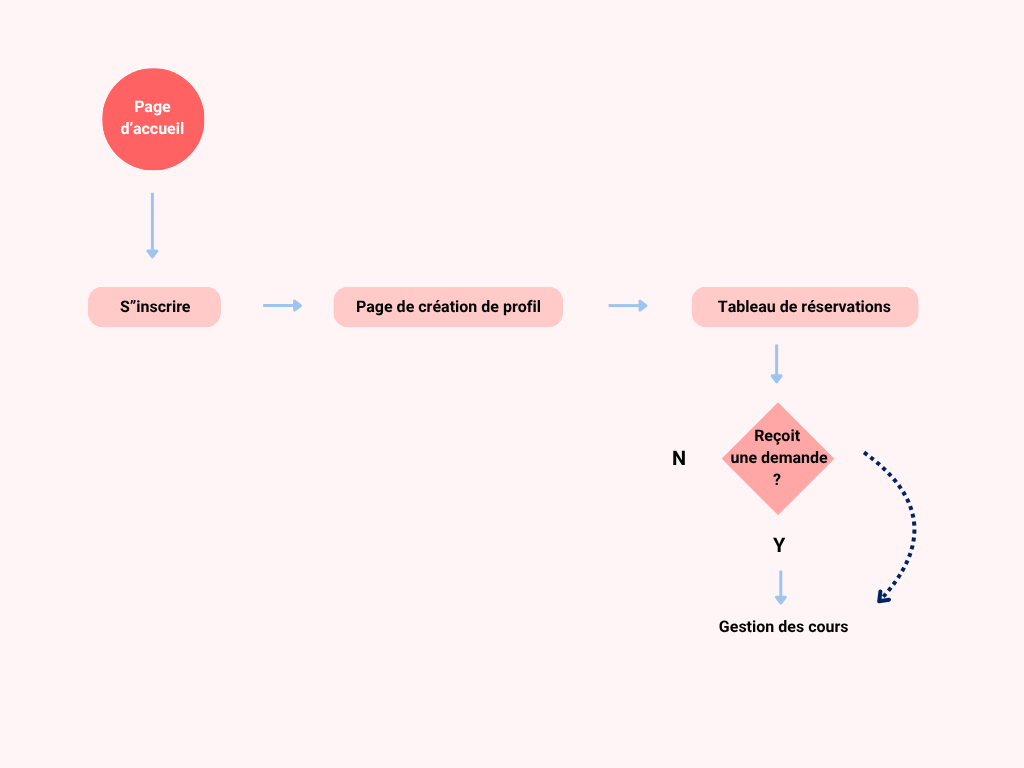 Maxime arrive sur la page d’accueil et commence par s’inscrire à la plateforme. Il passe ensuite à la création de son profil de tuteur, en renseignant ses compétences, disponibilités et informations clés. Une fois son profil complété, il accède à son tableau de réservations. Lorsqu’un élève lui envoie une demande, il peut accepter la réservation. Il gère ensuite ses cours directement depuis l’interface dédiée.