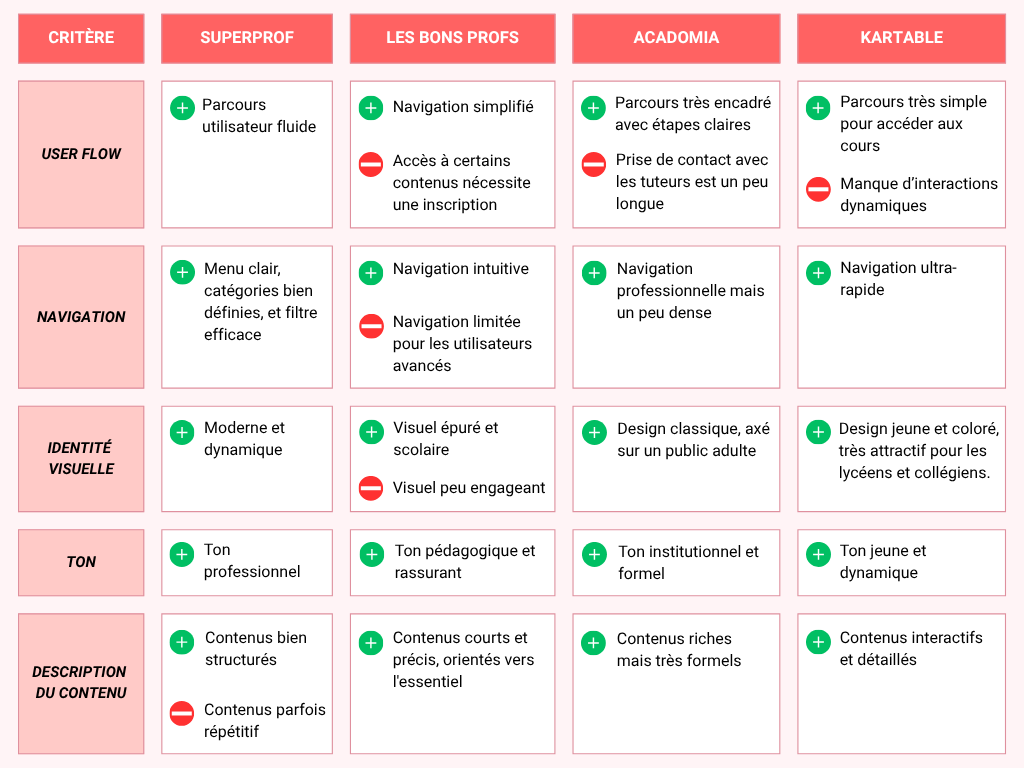 Afin de mieux comprendre le positionnement de notre future plateforme, j’ai analysé quatre concurrents majeurs du secteur : Superprof, Les Bons Profs, Acadomia et Kartable. Chacun présente des atouts spécifiques, mais aussi des limites qui ont orienté certaines de mes décisions de conception.