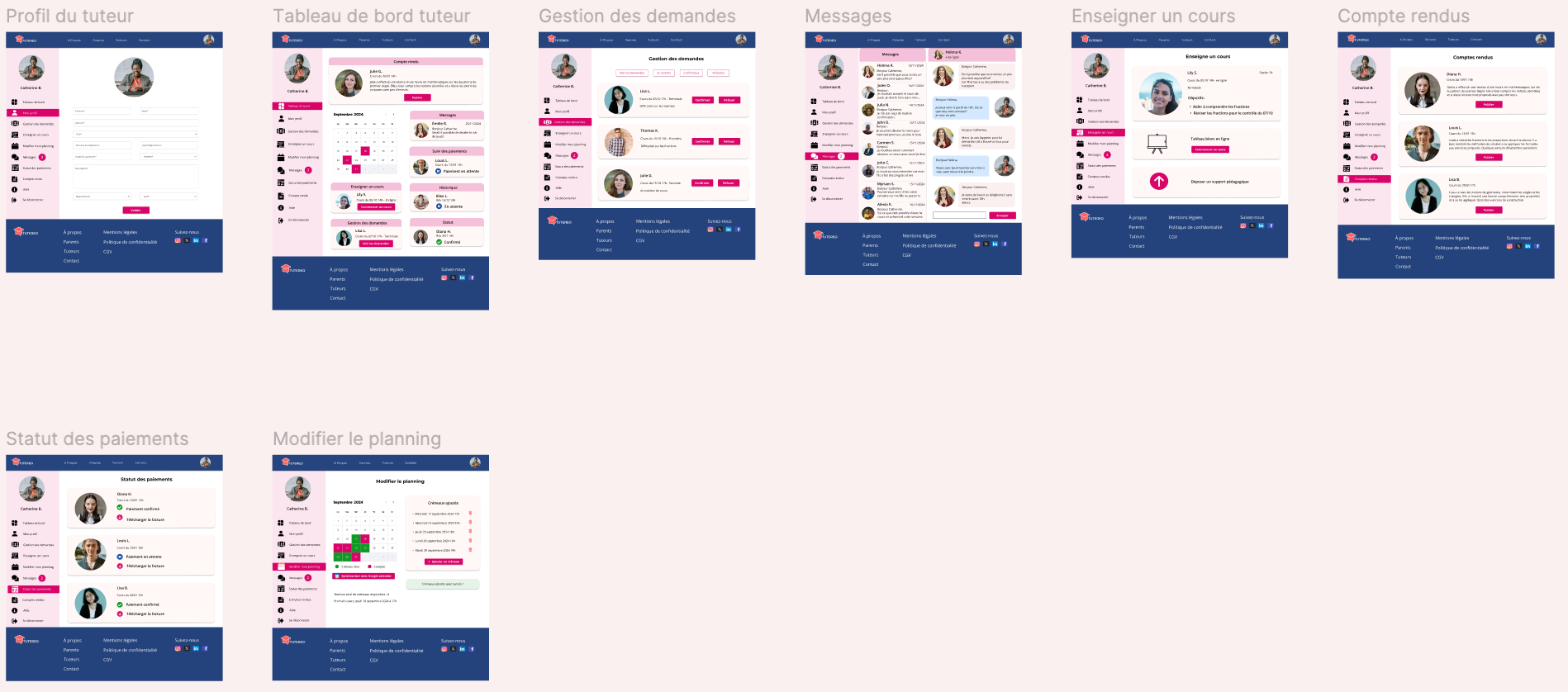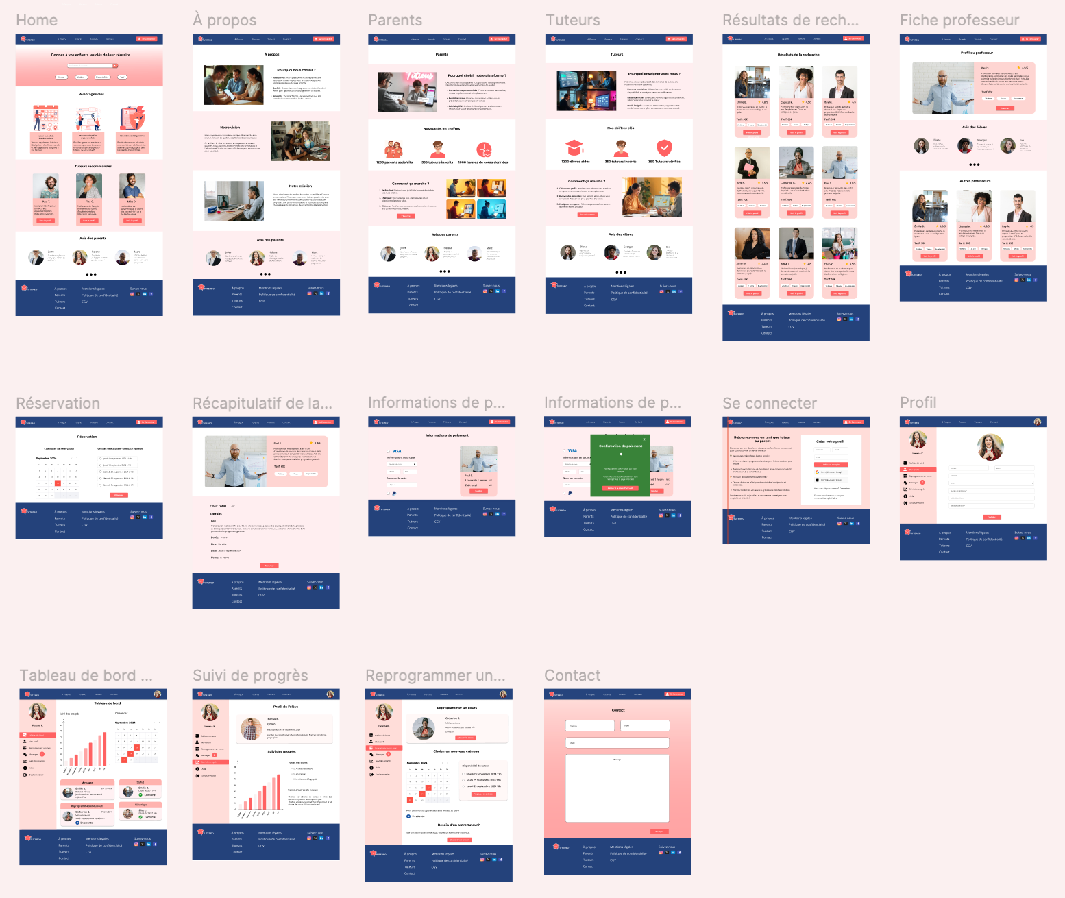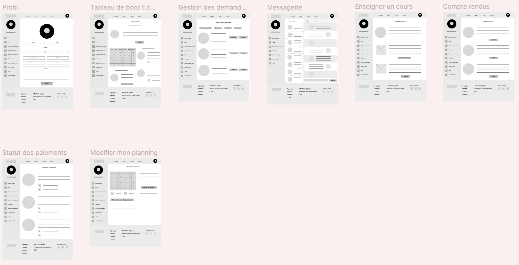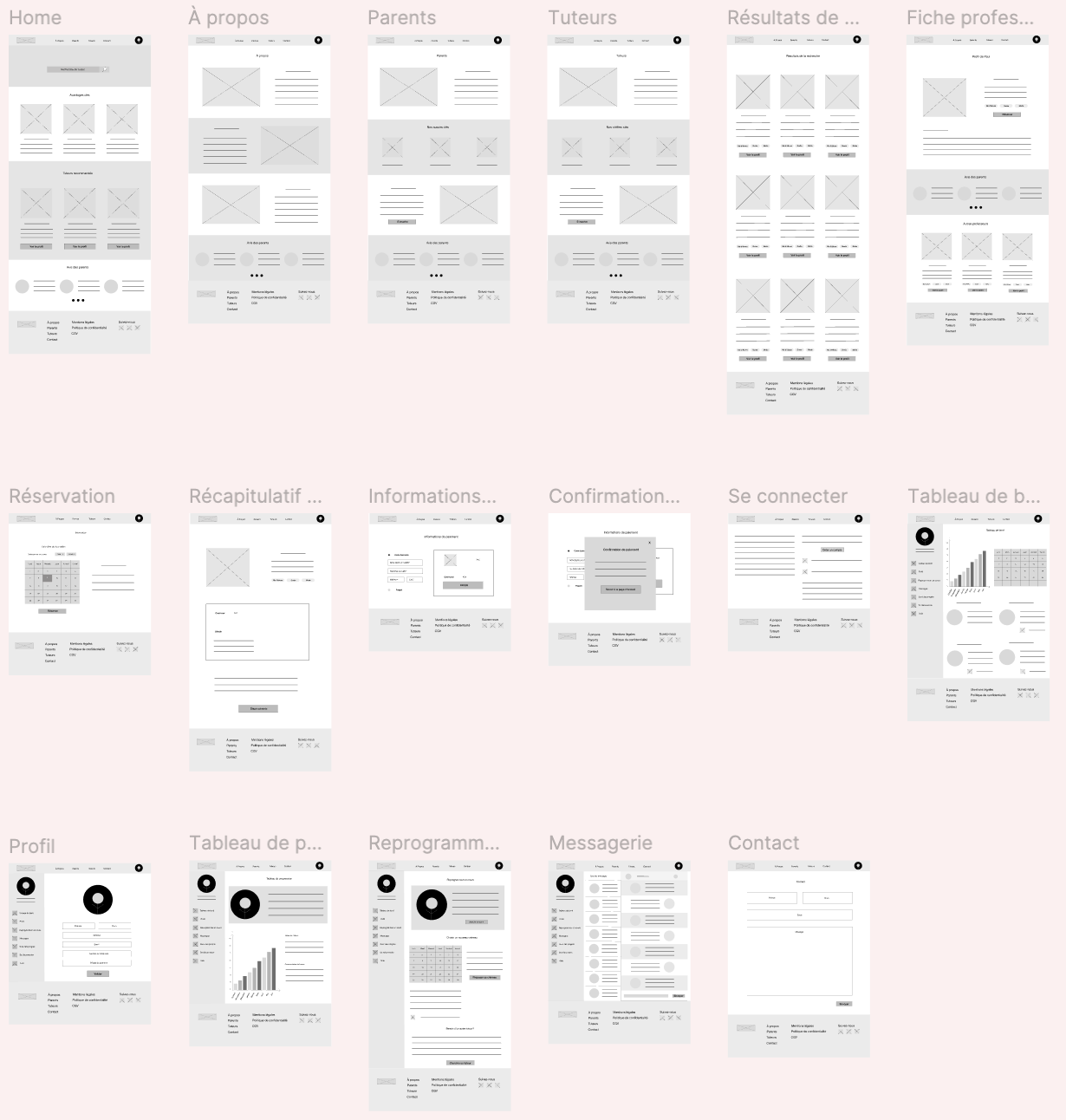 Ces wireframes représentent le parcours utilisateur principal pour Tutereo conçue pour répondre aux besoins des parents et des tuteurs. L’objectif est de proposer une interface intuitive permettant de rechercher, réserver et suivre des cours particuliers en toute simplicité.