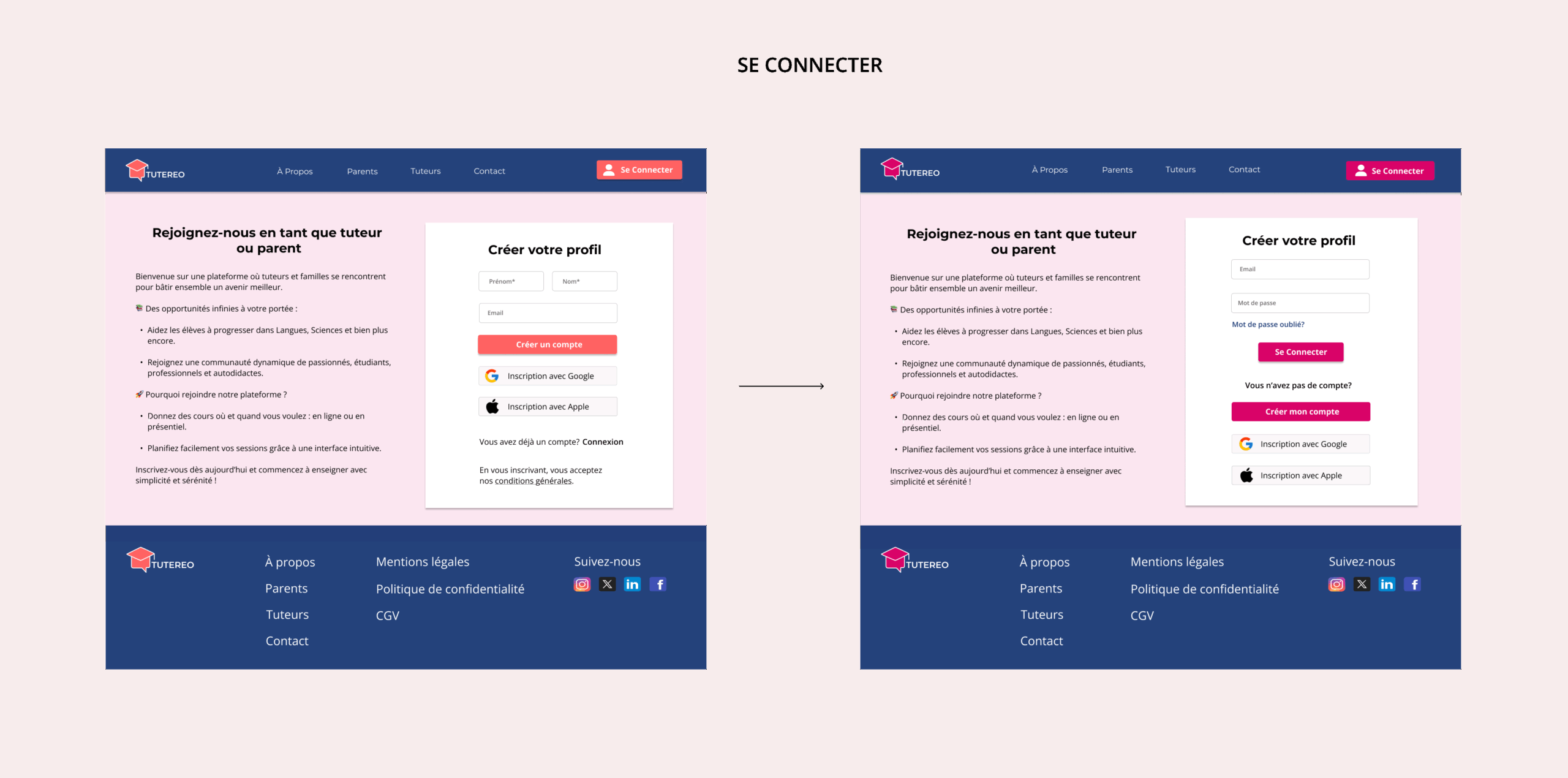 - Connexion: La première version de la page créait une confusion entre inscription et connexion, car l’inscription était mise en avant tandis que l’accès à la connexion restait peu visible et peu fluide.