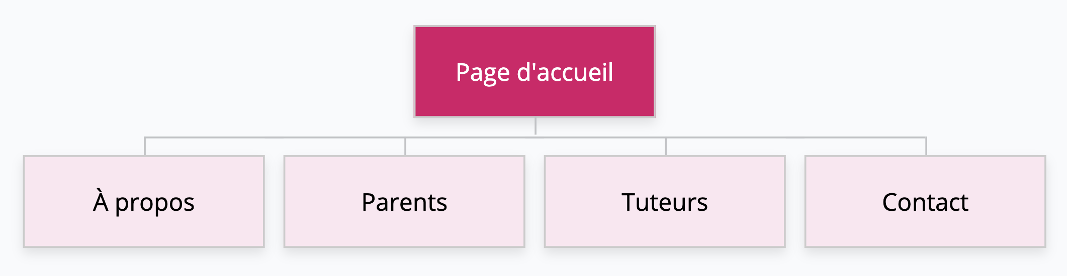 L’architecture de l’information a été conçue de manière claire et hiérarchisée, en plaçant la page d’accueil au centre de la navigation et en organisant les contenus autour de quatre sections principales: À propos, Parents, Tuteurs et Contact. Cette structure permet d’assurer une orientation intuitive et un accès rapide aux informations clés de la plateforme.