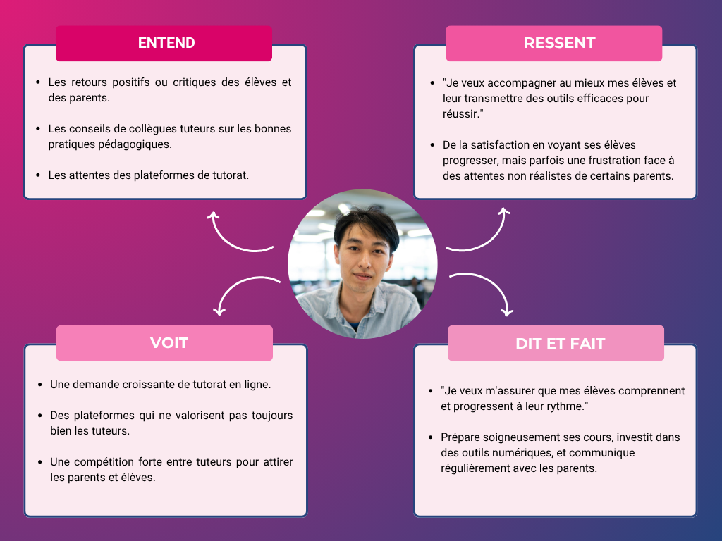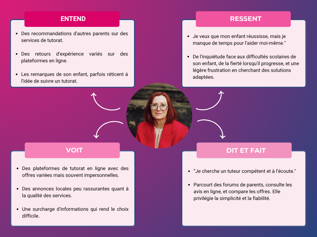 Pour comprendre les attentes réelles des utilisateurs, j’ai mené une recherche qualitative centrée sur deux profils clés : les parents à la recherche d’un soutien scolaire pour leurs enfants et les tuteurs souhaitant proposer leurs services. Cette phase a combiné entretiens individuels et questionnaires afin de recueillir des retours concrets sur leurs besoins, leurs frustrations et leurs habitudes actuelles.