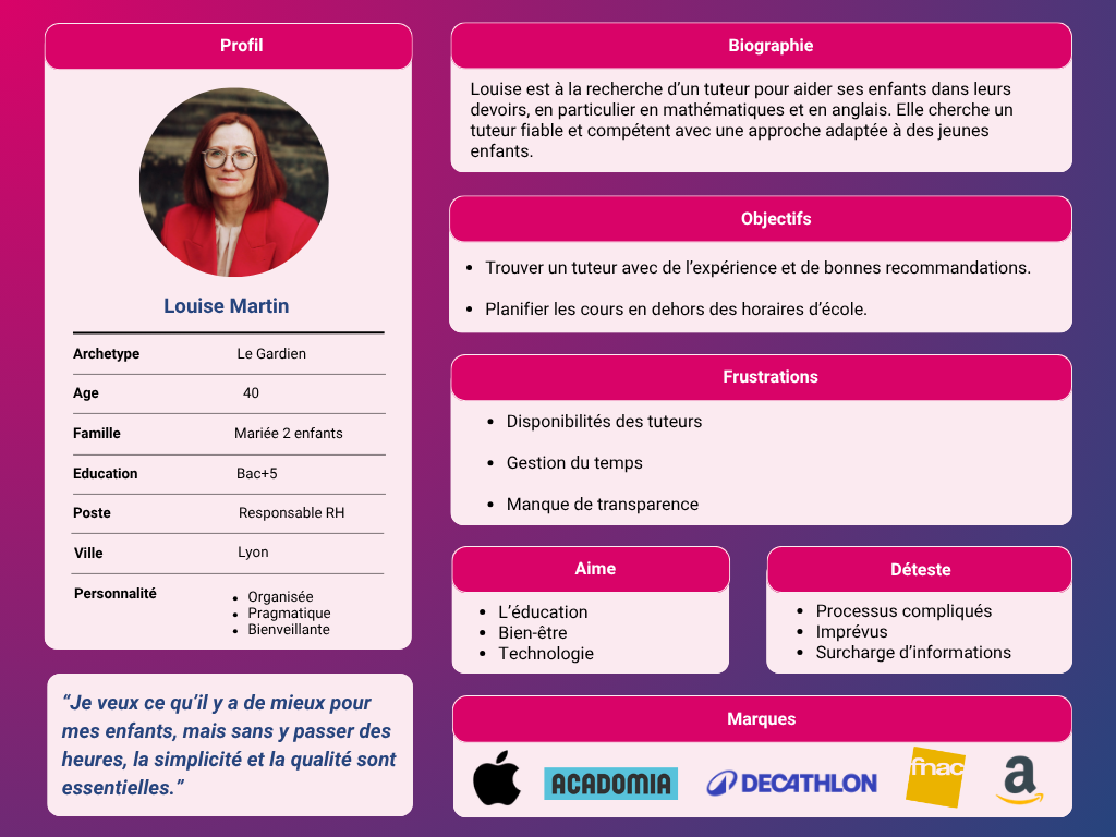 Louise veut être rassurée sur le sérieux du tuteur et la qualité des cours, tout en ayant une interface simple pour réserver, même dans son quotidien chargé.
