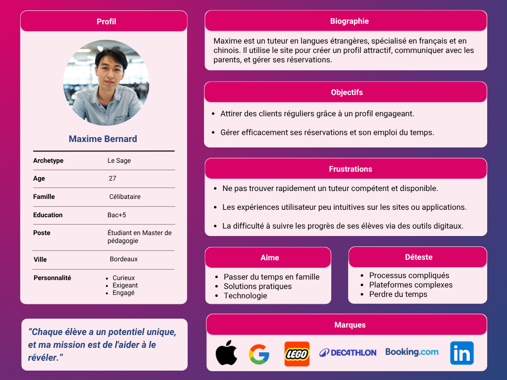 Maxime, jeune tuteur indépendant, souhaite trouver des élèves facilement tout en gardant le contrôle sur son emploi du temps.