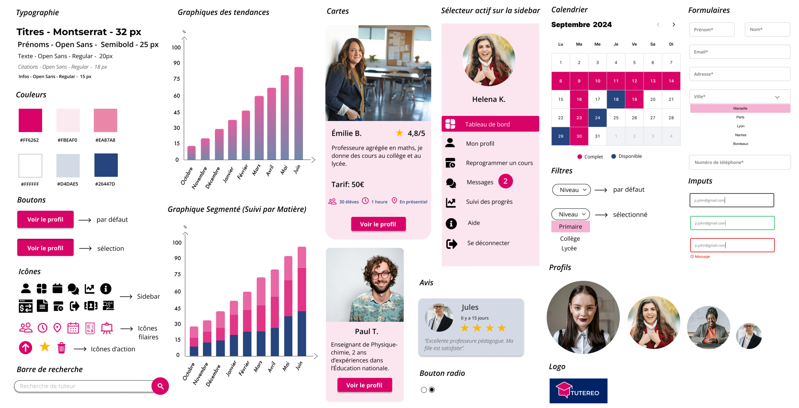 Ce UI kit a été conçu pour assurer une cohérence visuelle et fonctionnelle à travers l’ensemble de l’application. Il regroupe les éléments clés de l’interface : typographies, couleurs, composants (boutons, formulaires, cartes), ainsi que les icônes et graphiques. Chaque choix a été pensé pour garantir une navigation intuitive et une expérience utilisateur agréable. L’objectif est de créer une interface claire, accessible et engageante pour les élèves comme pour les tuteurs.