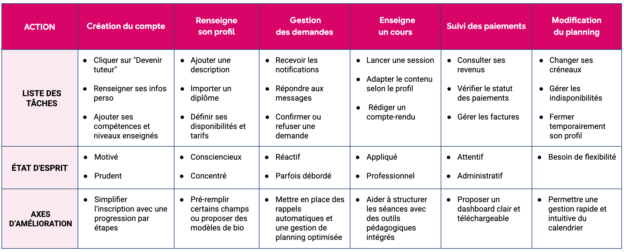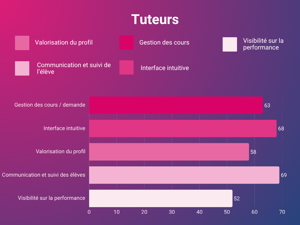 Les parents ont exprimé leur difficulté à trouver des tuteurs de confiance et bien qualifiés, soulignant l’importance d’une plateforme claire, fiable et facile à utiliser. De leur côté, les tuteurs recherchent une meilleure visibilité, des outils de gestion simplifiés, et un moyen efficace de communiquer avec les familles. Ces retours ont permis d’orienter les premières décisions de conception et de poser des bases solides pour construire une solution réellement utile.
