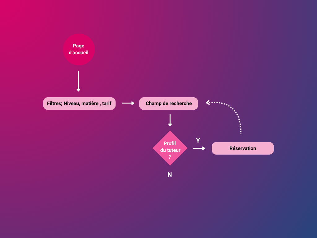 Louise commence son parcours sur la page d’accueil, où elle utilise les filtres pour préciser le niveau, la matière et le tarif souhaité. Elle saisit ensuite ses critères dans le champ de recherche. Si un profil de tuteur correspond à ses attentes, elle le consulte plus en détail. Lorsque le tuteur lui convient, elle passe à l’étape de réservation. Sinon, elle retourne à la recherche pour affiner son choix.