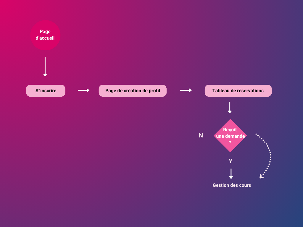 Maxime arrive sur la page d’accueil et commence par s’inscrire à la plateforme. Il passe ensuite à la création de son profil de tuteur, en renseignant ses compétences, disponibilités et informations clés. Une fois son profil complété, il accède à son tableau de réservations. Lorsqu’un élève lui envoie une demande, il peut accepter la réservation. Il gère ensuite ses cours directement depuis l’interface dédiée.