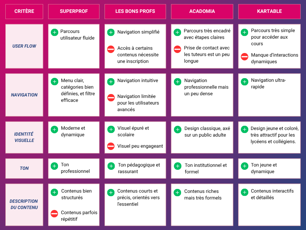 Afin de mieux comprendre le positionnement de notre future plateforme, j’ai analysé quatre concurrents majeurs du secteur : Superprof, Les Bons Profs, Acadomia et Kartable. Chacun présente des atouts spécifiques, mais aussi des limites qui ont orienté certaines de mes décisions de conception.