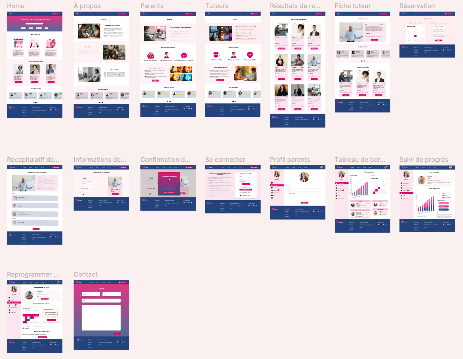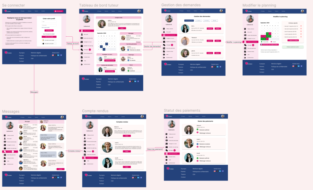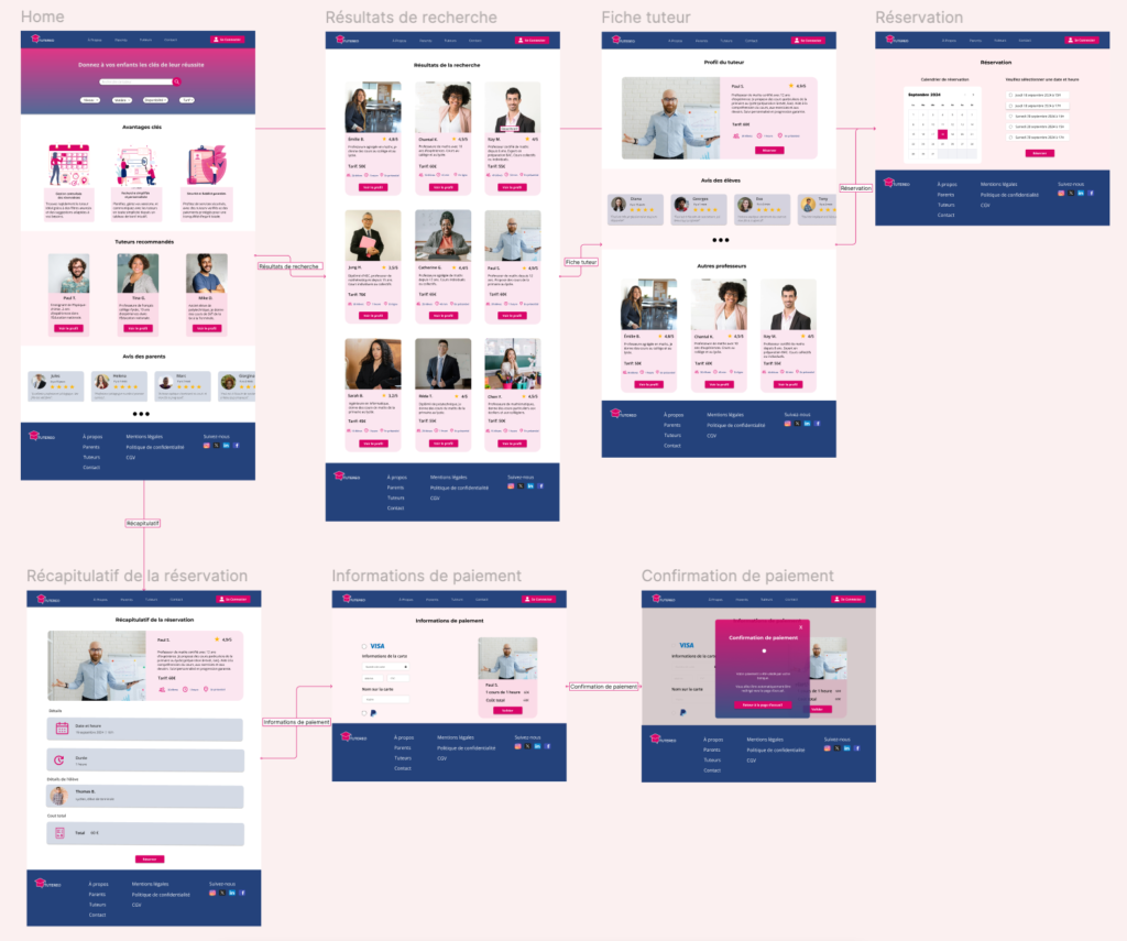 Ces wireframes représentent le parcours utilisateur principal pour Tutereo conçue pour répondre aux besoins des parents et des tuteurs. L’objectif est de proposer une interface intuitive permettant de rechercher, réserver et suivre des cours particuliers en toute simplicité.